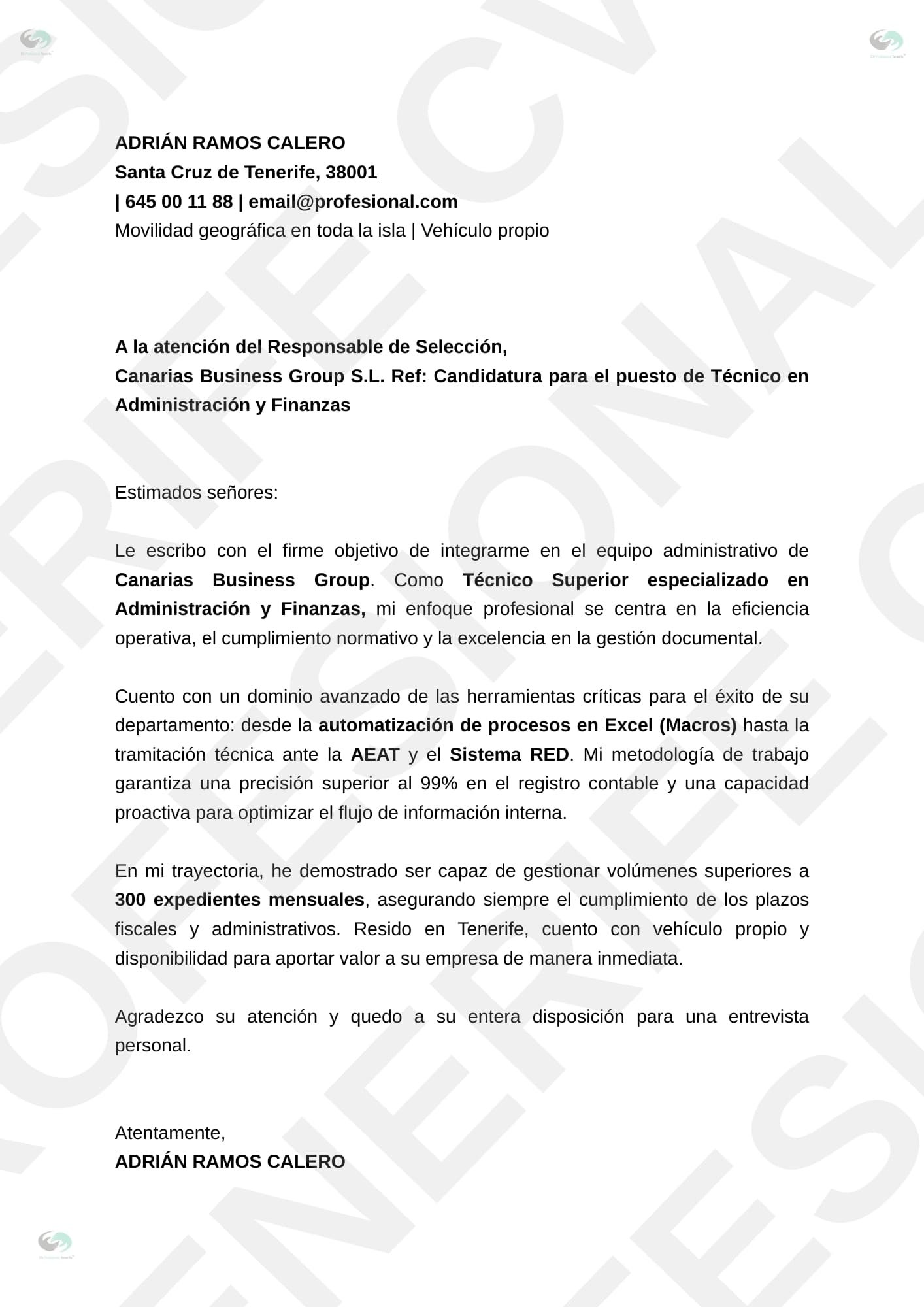 ✉️ Carta de Presentación Persuasiva: Redactada con lenguaje corporativo impecable, destacando tu capacidad de organización y lealtad.