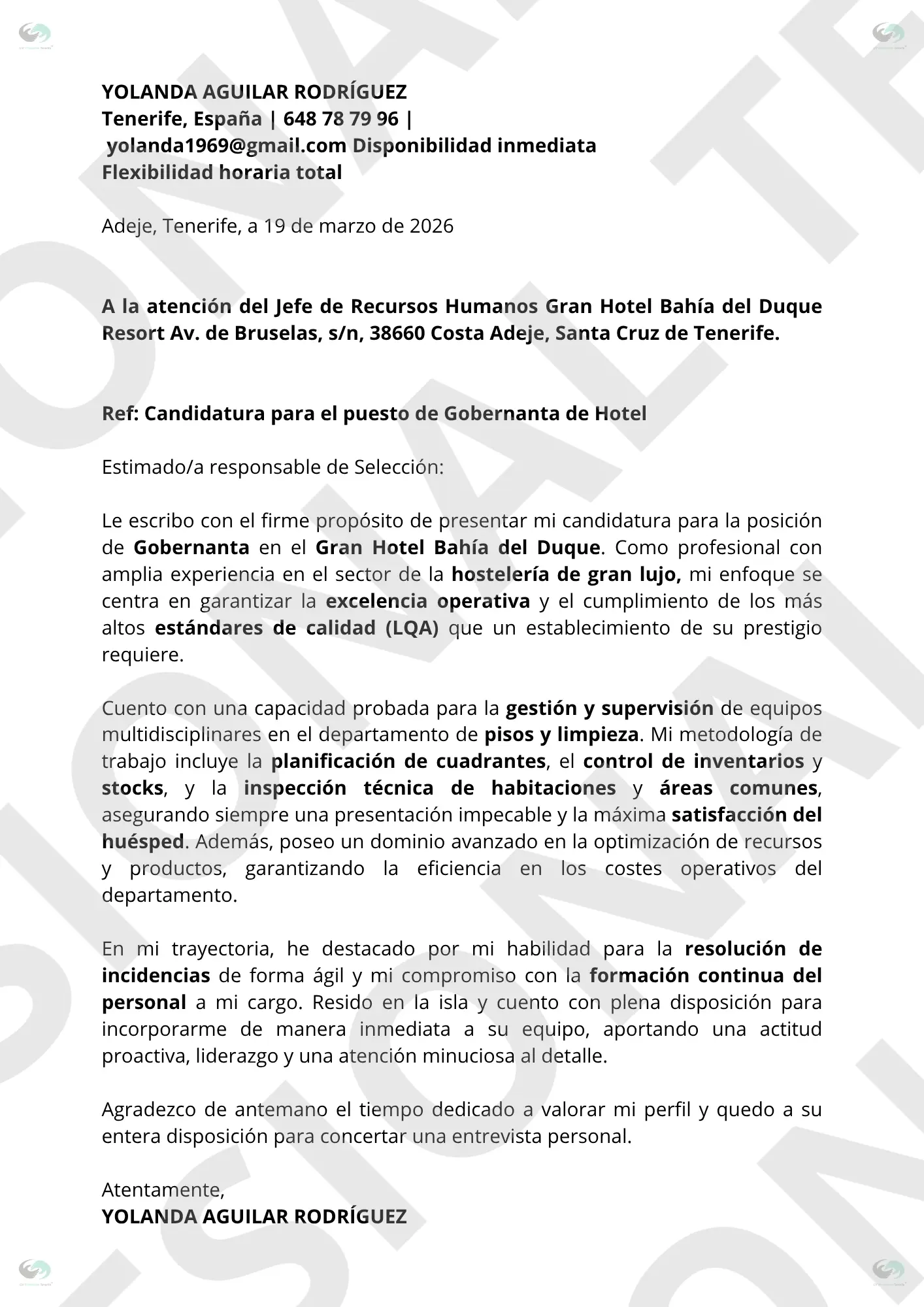Por un precio altamente competitivo de 34,99 €, transformamos tu trayectoria en un documento de alto impacto, diseñado específicamente para las exigencias de la hotelería de 4 y 5 estrellas y el sector de lujo en Tenerife (desde Costa Adeje hasta el Puerto de la Cruz).