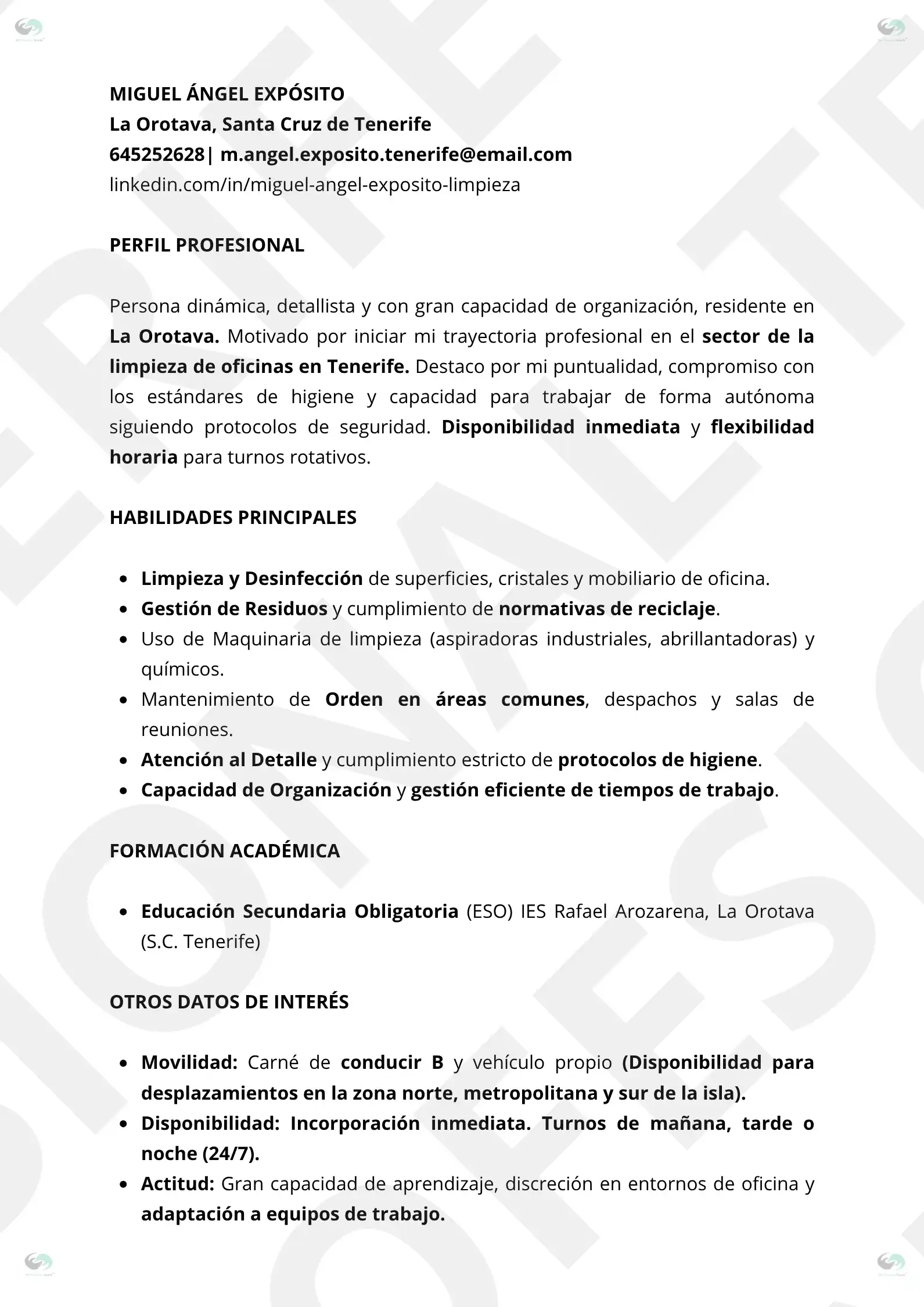 CV Profesional Operario Limpieza de Oficinas en Tenerife