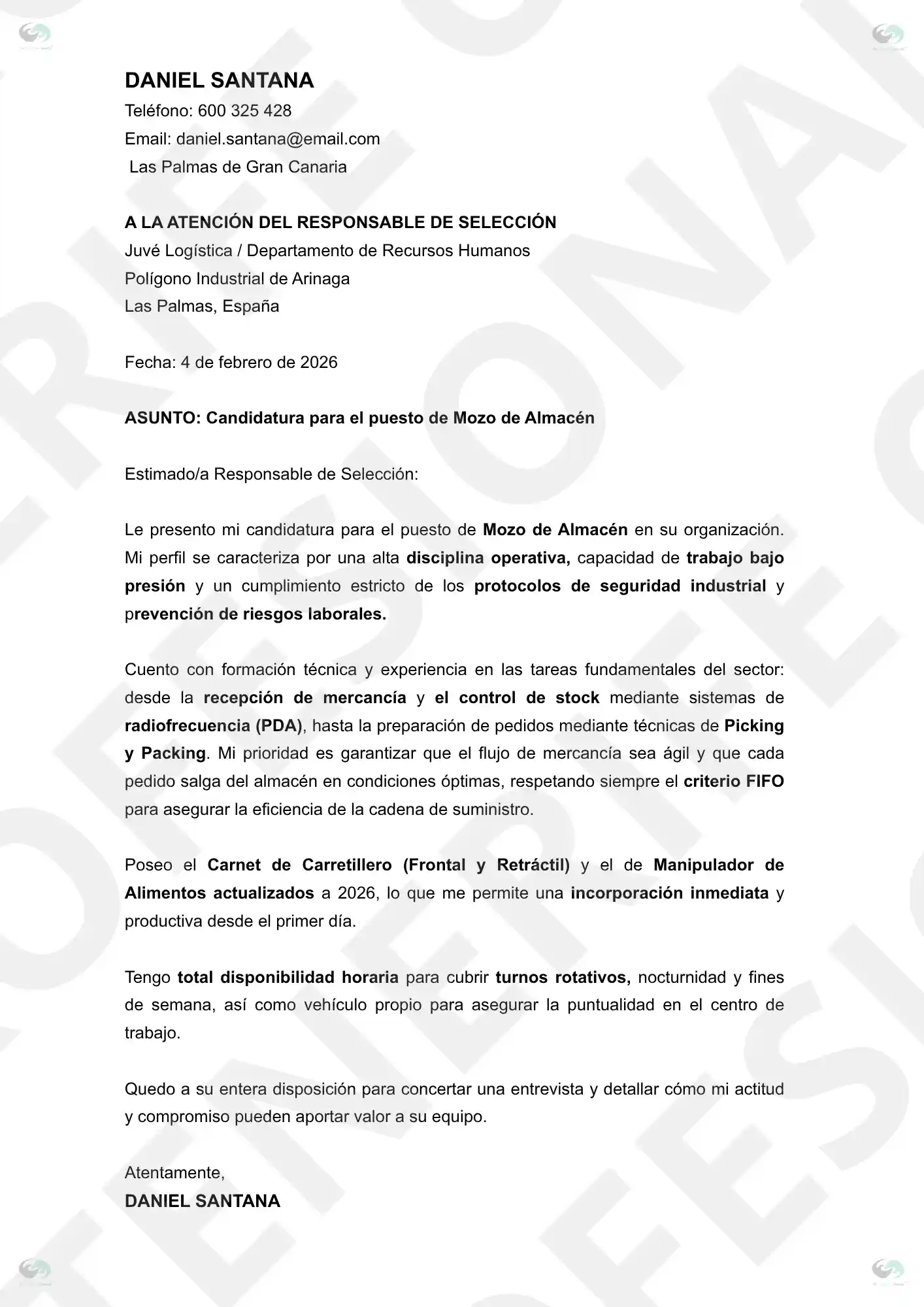 Hemos integrado en las plantillas las keywords estratégicas que los sistemas ATS de las grandes distribuidoras canarias buscan: Picking, Packing, Gestión FIFO/LIFO, Control de Inventario, Transpaleta Eléctrica y Normativa UNE 58451.