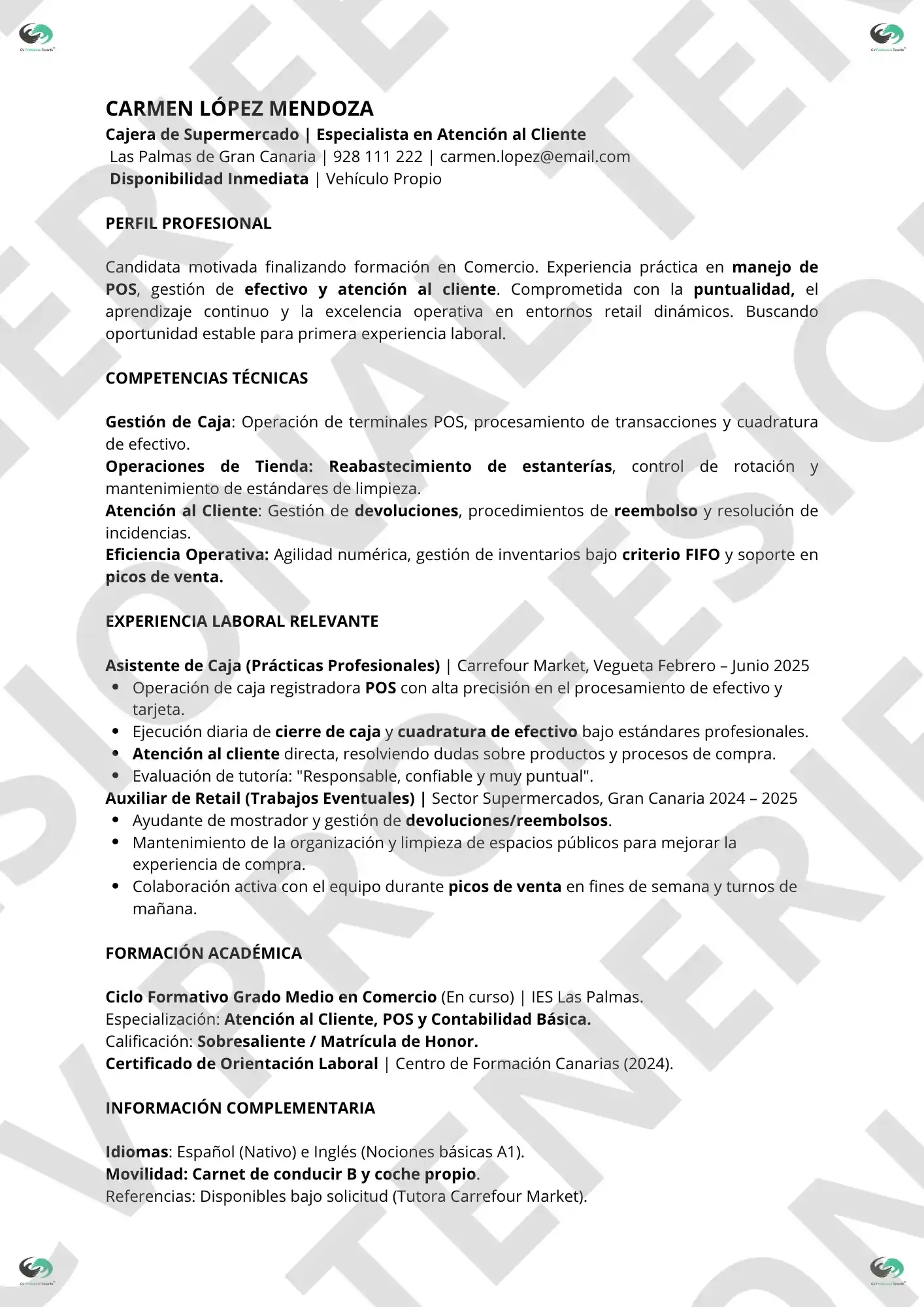 Consigue tu empleo en el sector comercio con nuestro Pack Premium de CV Profesional Cajera de Supermercado en Tenerife / Optimizado Filtros ATS.