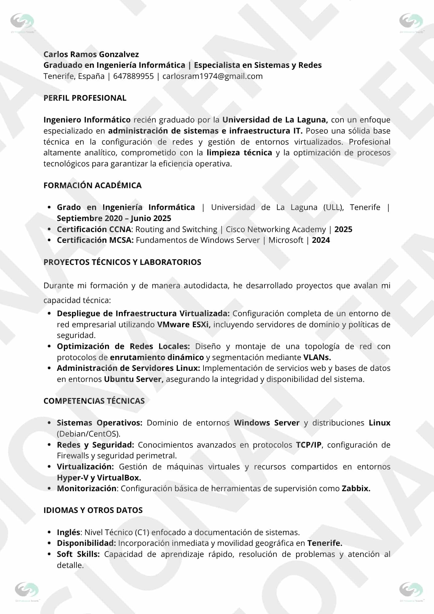Valor para el Talento Emergente: Si estás pivotando hacia la administración de sistemas o acabas de terminar tu formación en la isla, este modelo resalta tus proyectos prácticos, laboratorios propios y certificaciones técnicas (CCNA, AZ-104, ASIR). ¡Convierte tu potencial en una realidad técnica! ⚡