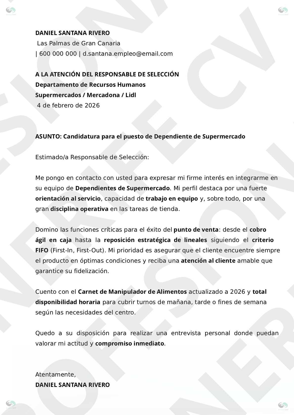 Carta de Presentación Premium: Redactada con un lenguaje persuasivo que conecta tus habilidades con las necesidades de las tiendas en Tenerife, lista para personalizar en segundos.