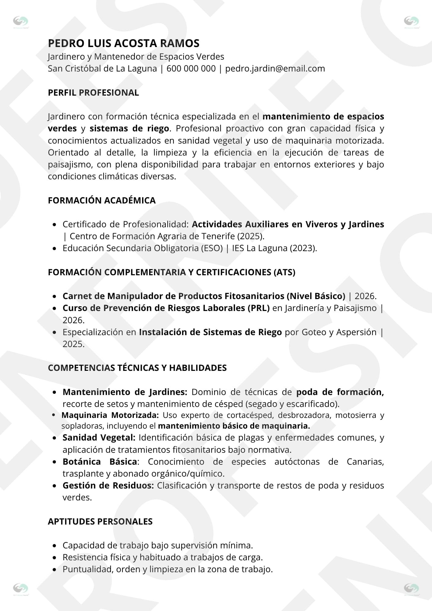💎 Diseño Limpio y Profesional: Olvida los currículums hechos en locutorios con formatos antiguos. Entregamos diseños modernos, limpios y que transmiten orden (vital para alguien que cuida jardines).